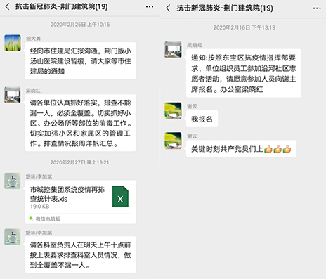 疫情防控期间,公司成立“抗击新冠肺炎――荆门建筑院”微信工作群,领导小组及时传达市疫情防控指挥部的决策部署和工作要求,定期汇总工作情况和疫情信息。