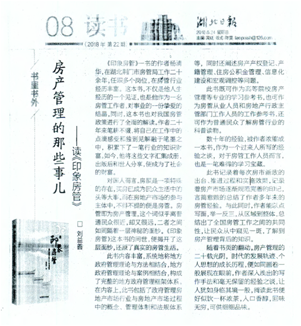 6月24日,原省作协副主席、现《长江文艺》杂志社社长刘益善亲笔撰写书评《房产管理的那些事儿――读〈印象房管〉》,并登载于《湖北日报》。称此书内容丰富,受众面广,既可作为高等院校的专业学习参考书,也可作为房管从业人员的工具书,还可作为普通民众了解房管行业的科普读物。刘益善社长感言,“随着书页的翻动,房产管理的二十载光阴,时代的发展轨迹、个人思想的成长历程,便如同画卷一般展现在眼前。作者深入浅出的写作手法和毫无保留的经验之谈,让人犹如身临其境一般,阅读此书便好似饮一杯浓茶,入口香醇,回味无穷,可供细细品味。”(苏芙蓉 周梦婷)