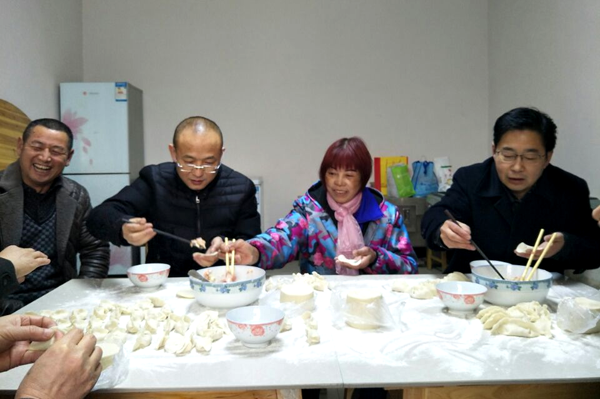 荆门市供水总公司领导与贫困户一起包饺子、过新年